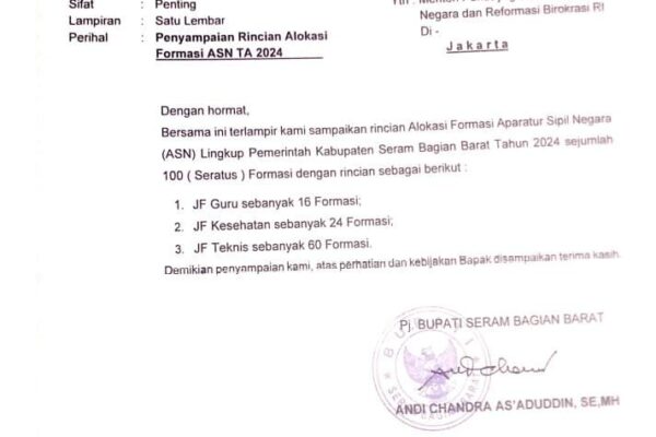 SPIONNEWS.ID, Maluku – Berdasarkan rincian alokasi Formasi ASN Tahun 2024 sesuai surat permohonan Nomor 800.1.2.1/15 tertanggal 25 Januari 2024 kepada…