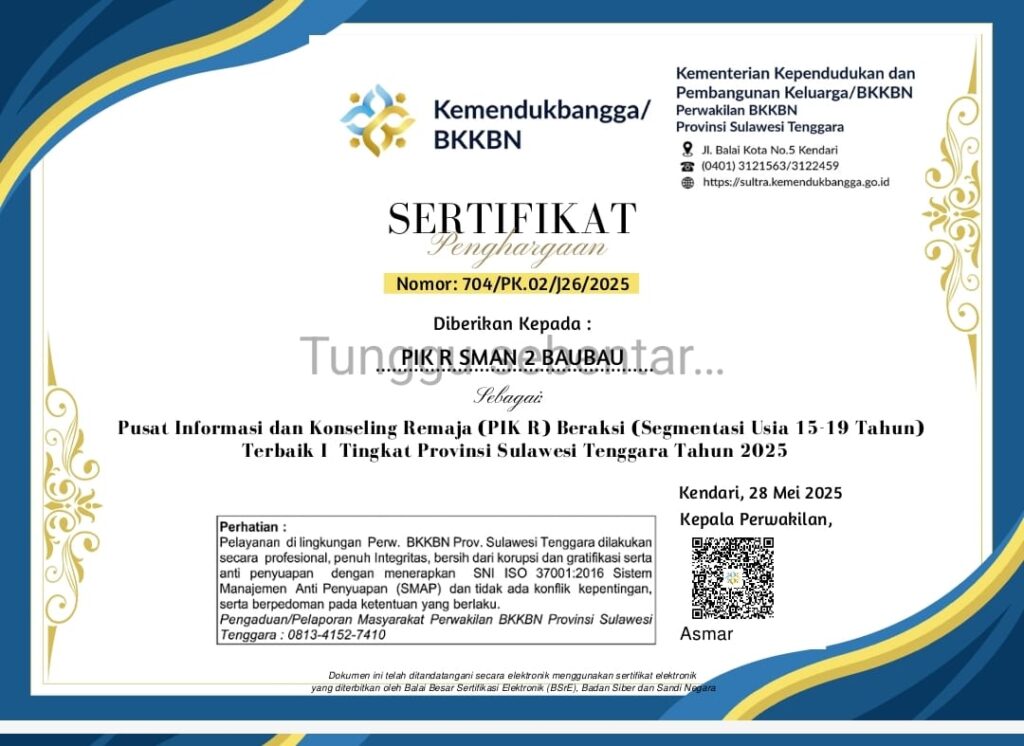 - Terbaik 1 Kategori PIK-R Percontohan Segmentasi Beraksi (SMA/sederajat) diwakili SMAN 2 Baubau, dan