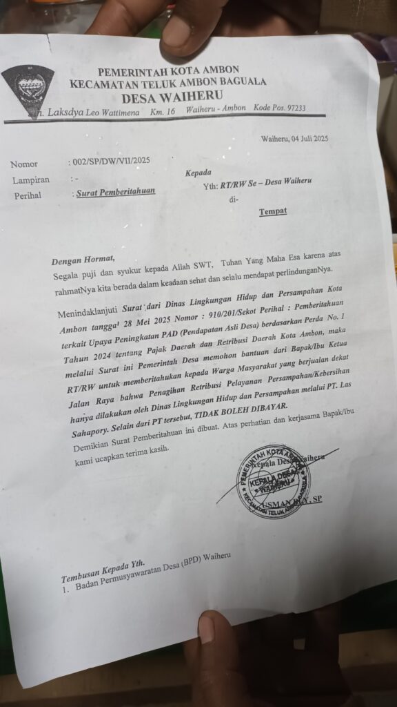 “katong pedagang tidak pernah disosialisasikan terkait penarikan retribusi sampah, mereka hanya menunjukan surat edaran dari pihak Pemerintah Desa waiheru,” (**)