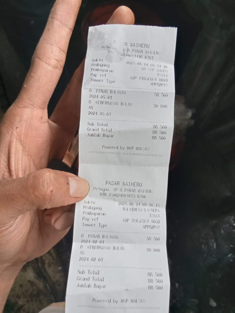 pedagang, pasalnya Penagihan dengan nilai 88.500 rupiah /bulan untuk sewa tempat sudah termasuk distribusi sampah didalamnya namun pedagang masih dipungut retribusi sampah 5000 rupiah / hari oleh petugas lain yang mengaku bekerjasama dengan pihak Pemerintah Kota Ambon