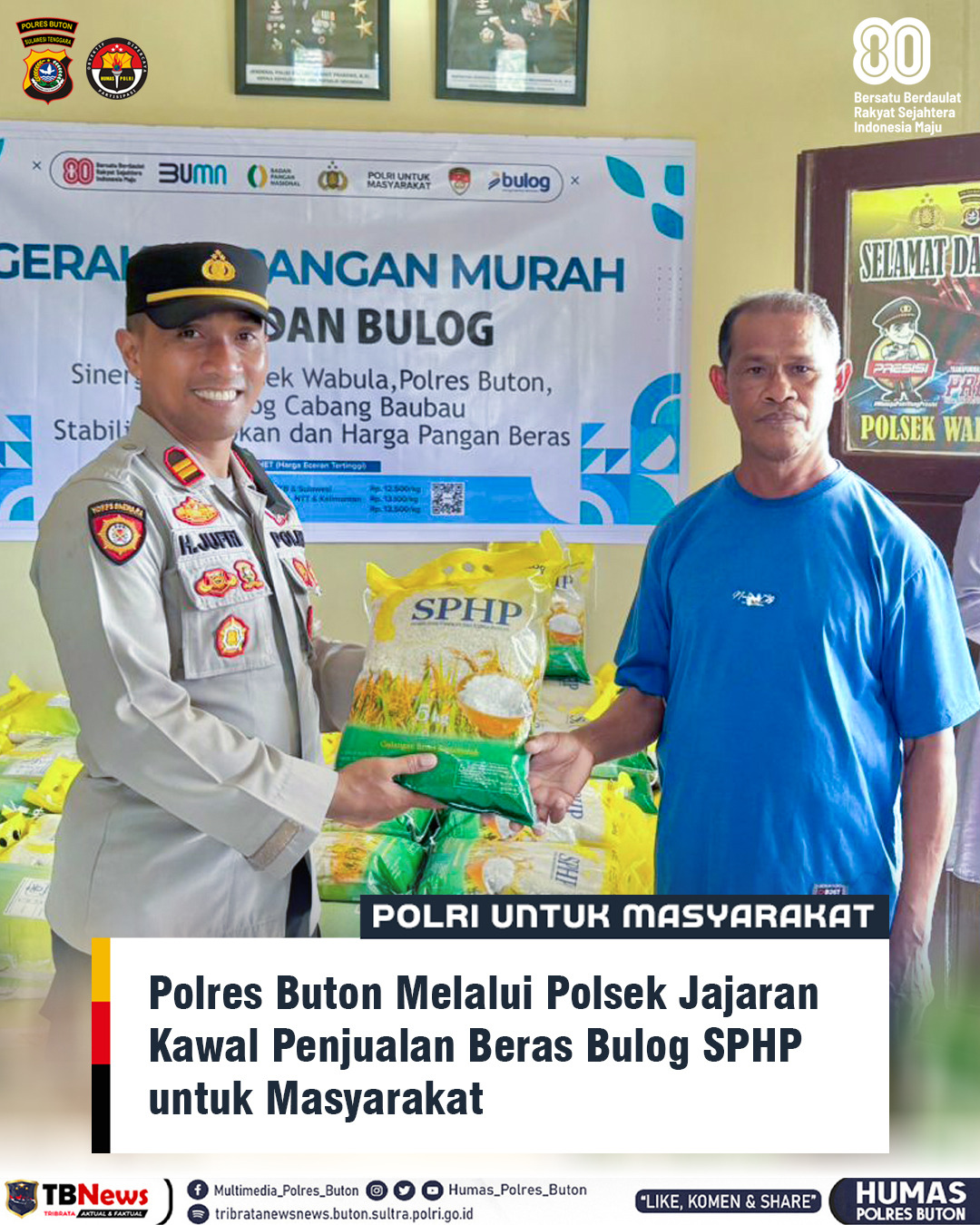 SPIONNEWS, Buton – Dalam rangka mendukung program Stabilitas Pasokan dan Harga Pangan (SPHP), Polsek Jajaran Polres Buton melaksanakan kegiatan pangan murah beras SPHP Bulog kepada warga. 23/08/25