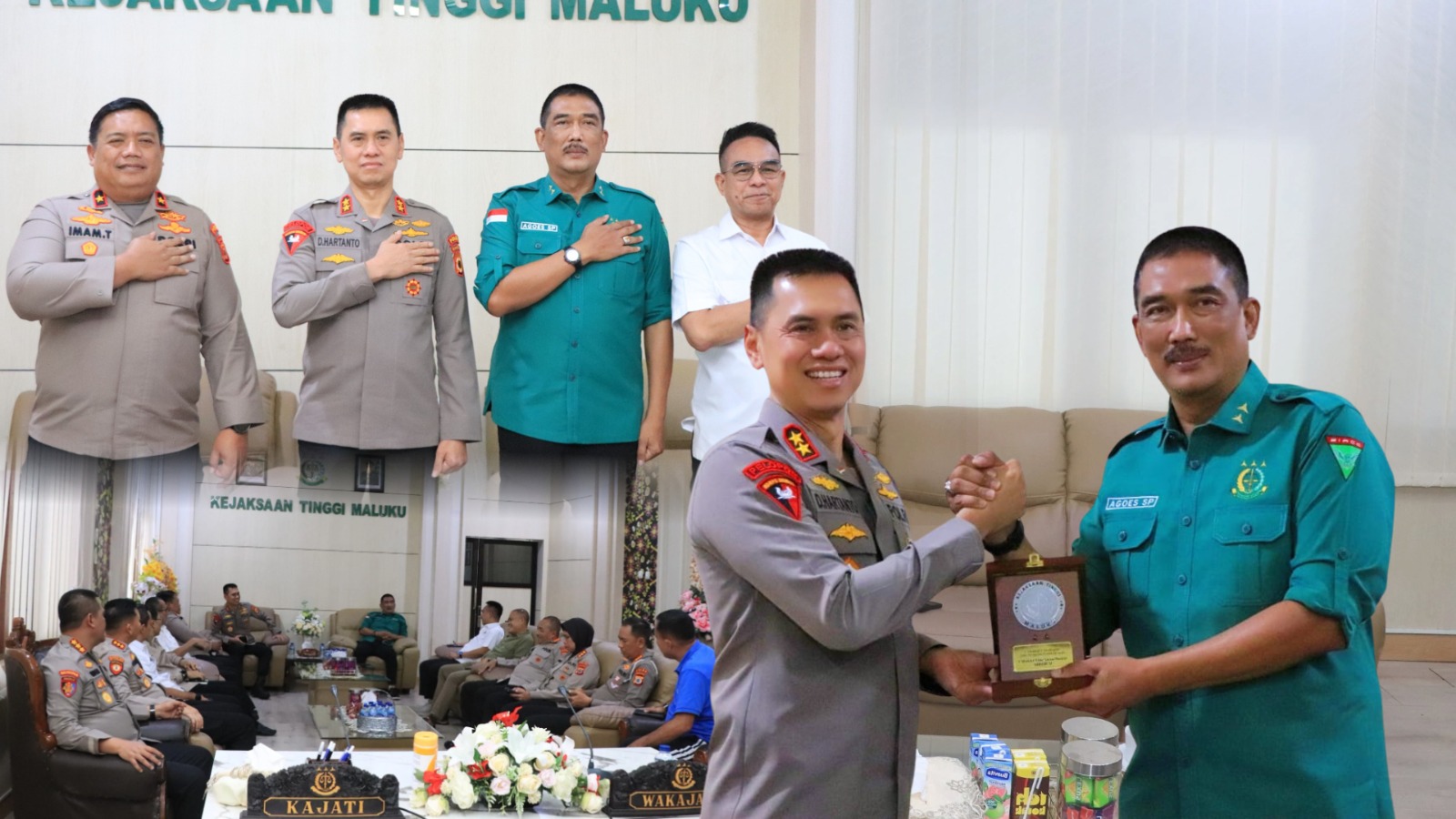Sementara itu, Kajati Maluku, Agoes SP yang didampingi segenap jajarannya, menyambut hangat kedatangan Kapolda Maluku beserta rombongannya di Kejaksaan Tinggi Maluku.