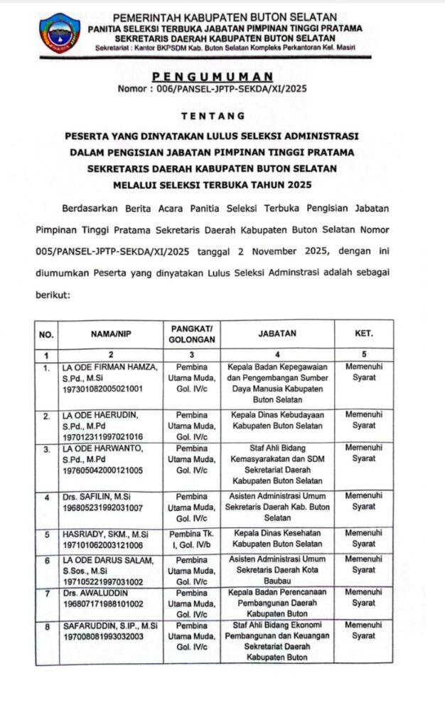 Berdasarkan akun resmi BKPSDM Kabupaten Buton Selatan, terlihat dari 9 orang yang calon Sekda Kabupaten Buton Selatan terlihat tinggal 8 orang yang lolos tahapan seleksi administrasi.
