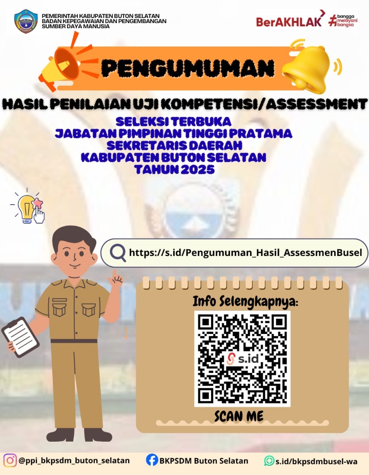 Menurut Ketua Sekretariat Panitia Seleksi Jabatan Pimpinan Tinggi (JPT) Pratama Sekretaris Daerah Kabupaten Buton Selatan Ahmad Jamaluddin menjelaskan bahwa tahapan assessment center telah selesai dilaksanakan pada tanggal 4 November s.d 5 November 2025 lalu yang bertempat di Kantor UPT Penilain Potensi dan Kompetensi BKD Prov. Sulawesi Selatan dan hasilnya Insha Allah diumumkan hari ini, secara terbuka melalui laman resmi Pemerintah Kabupaten Buton Selatan dan Media Sosial BKPSDM Kabupaten Buton Selatan berdasarkan Pengumuman Nomor 010/PANSEL-JPTP-SEKDA/XI/2025 tanggal12 November 2025 Tentang Hasil Penilaian Uji Kompetensi/Assesment Seleksi Terbuka Jabatan Pimpinan Tinggi Pratama Sekretaris Daerah Kabupaten Buton Selatan Tahun 2025.