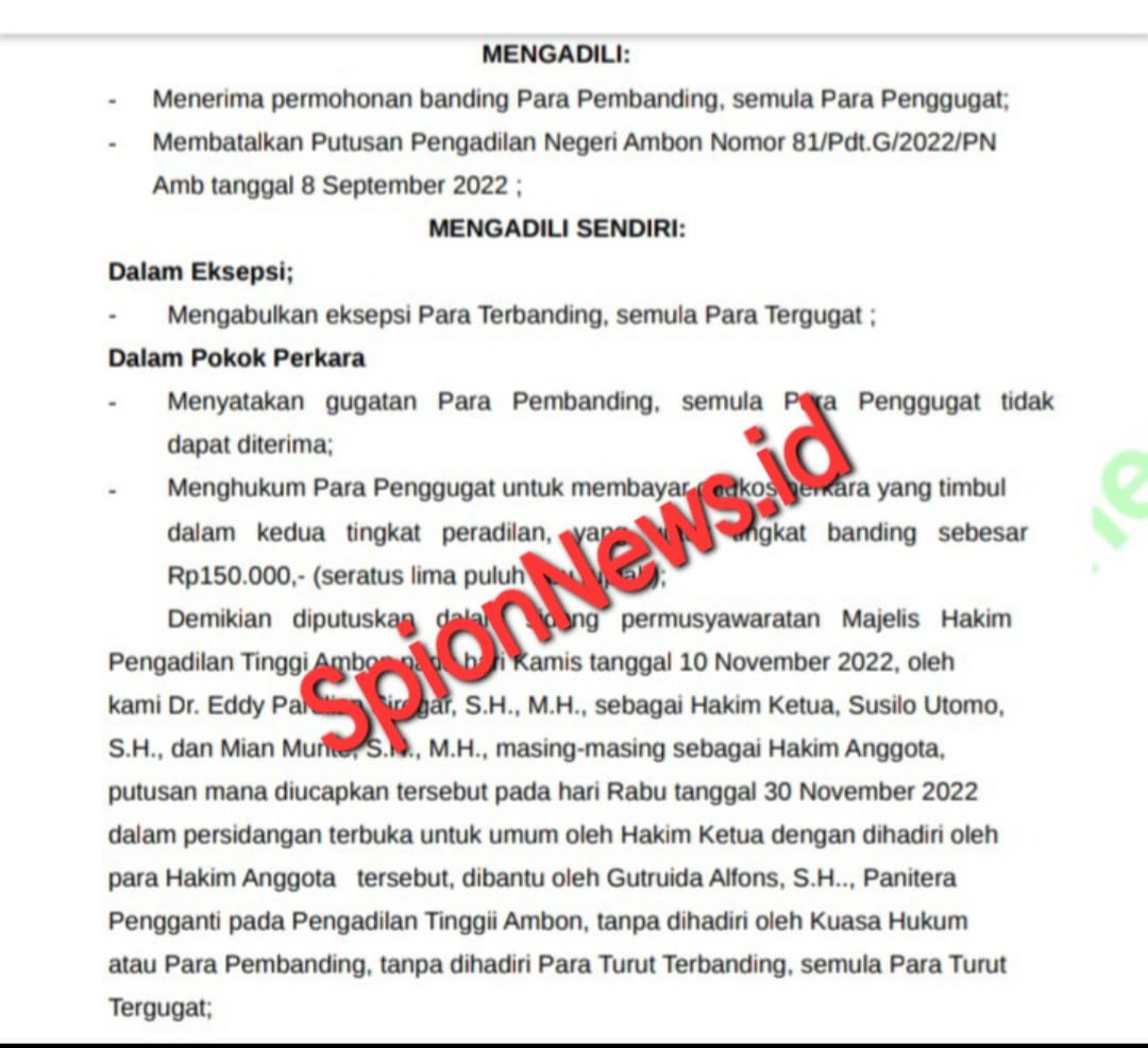 "Putusan pengadilan menyatakan Gugatan para pembanding, semula para penggugat TIDAK DAPAT DITERIMA. Itu disebut 'NO'. Putusan "NO" (Niet Ontvankelijke) atau "Tidak Dapat Diterima" Putusan 'ini justru menguntungkan dan menguatkan posisi kami," tegas Aswar.