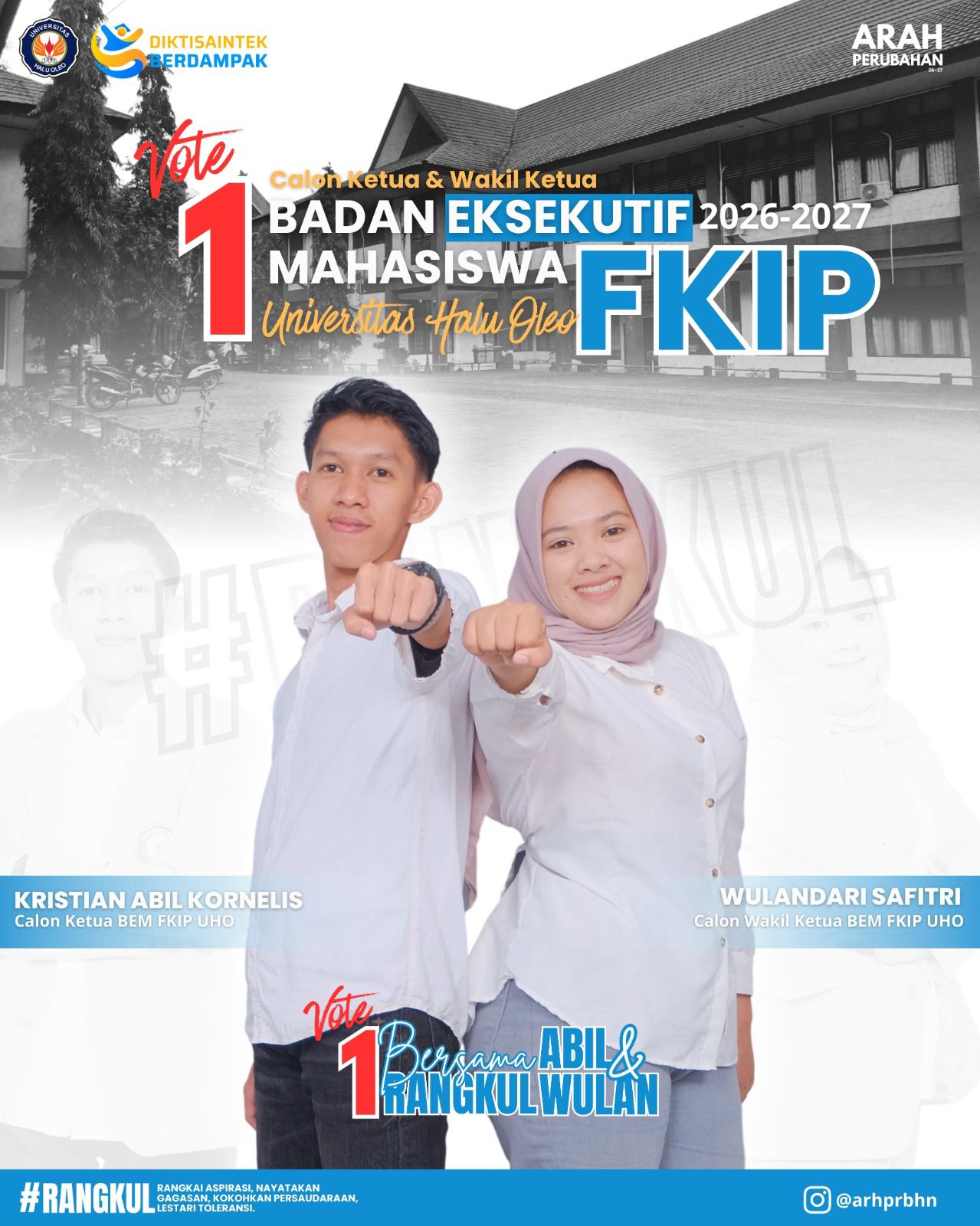 Gagasan tersebut di gawangi oleh salah satu calon Ketua BEM & Wakil Ketua BEM FKIP UHO. Mereka hadir dengan nomor urut 1 Abil sebagai Calon ketua dan Wulan sebagai calon wakil ketua.