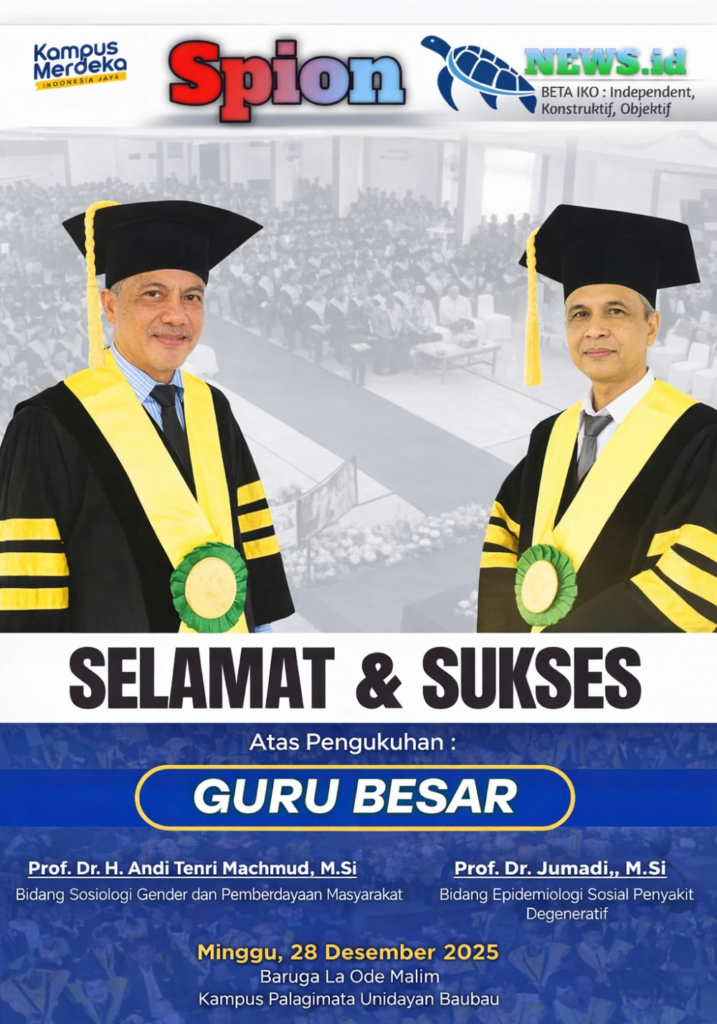 SPIONNEWS.ID, BAUBAU - Pemimpin Redaksi beserta Kru spionnews.id mengucapkan Selamat dan Sukses atas Pengukuhan, Bapak Prof. Dr. Andi Tenri Machmud, M.Si sebagai Guru Besar Bidang Sosiologi Gender dan Pemberdayaan Masyarakat dan Bapak Prof. Dr. Jumadi, M.Si sebagai Guru Besar Bidang Epidemiologi Sosial Penyakit Degeneratif di Baruga La Ode Malim Kampus Palagimata Unidayan Baubau, Minggu, 28 Desember 2025. Semoga amanah dan bermanfaat bagi umat. IA, amin.(*)