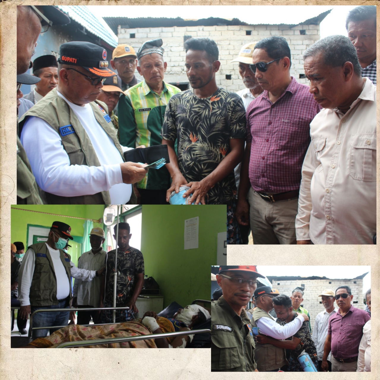 Oleh sebab itu, pada kunjungan itu Bupati menyalurkan sejumlah bantuan logistik mulai dari makanan hingga selimut kepada keluarga korban kebakaran dan santunan uang tunai sebesar Rp 1.000.000. Setelah memeriksa kondisi rumah tersebut, Adios melanjutkan kunjungannya ke UPTD Puskesmas Siompu Barat di Desa Molona dengan tujuan membesuk korban yang mengalami luka berat akibat kebakaran hebat tersebut.