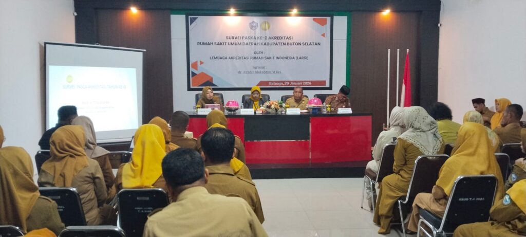 SPIONNEWS.ID, BATAUGA – Untuk bisa meningkatkan pelayanan kesehatan kepada masyarakat dan menjadi bagian daripada evaluasi, Rumah Sakit Umum Daerah (RSUD) Kabupaten Buton Selatan melaksanakan Survei Akreditasi Paska ke-2 yang laksanakan oleh Lembaga Akreditasi Rumah Sakit Indonesia (LARSI) yang dimainkan oleh dr. Hj. Asridah Mukaddim, M.Kes. Terkait sarana dan prasarana RSUD Buton Selatan sehingga pelayanan kesehatan kepada masyarakat menjadi optimal.