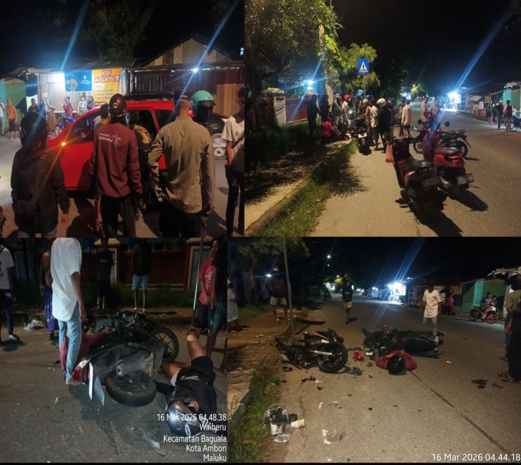 SPIONNEWS.ID, MALUKU – Kecelakaan lalu lintas yang melibatkan dua kendaraan roda dua terjadi di depan SMK Negeri 3 Waiheru, Kecamatan Baguala, Kota Ambon, Senin (16/03/2026) sekitar pukul 04.48 WIT.