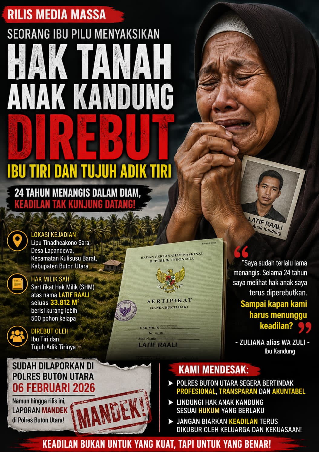 “24 TAHUN MENANGIS DALAM DIAM, HAK TANAH ANAK KANDUNG DIDUGA DIREBUT IBU TIRI DAN TUJUH ADIK TIRI, LAPORAN DI POLRES BUTON UTARA PUN MANDEK”