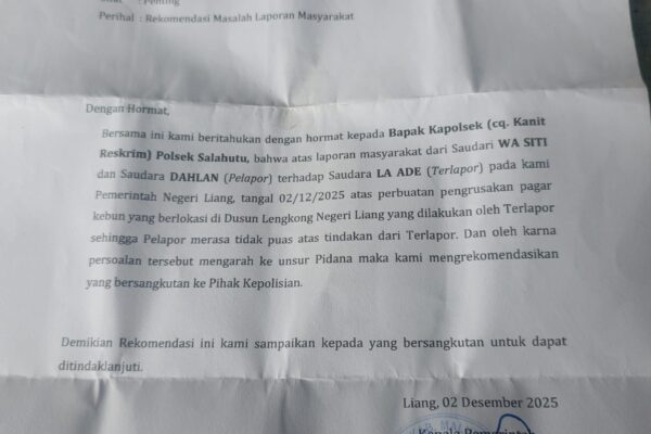 SPIONNEWS.ID, MALUKU – Pemerintah Negeri Liang, Kecamatan Salahutu, Kabupaten Maluku Tengah, resmi mengeluarkan surat rekomendasi kepada Polsek Salahutu terkait laporan…